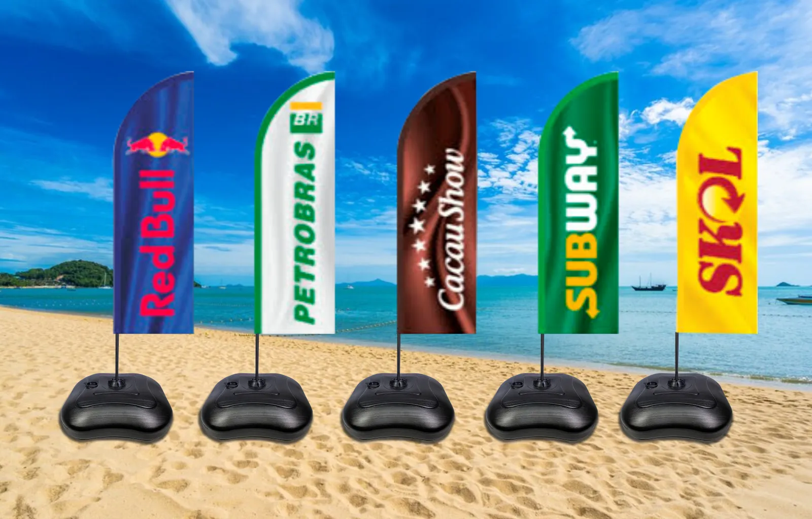 Serve tanto como base de wind banner, além de ser compatível com hastes de diferentes materiais.